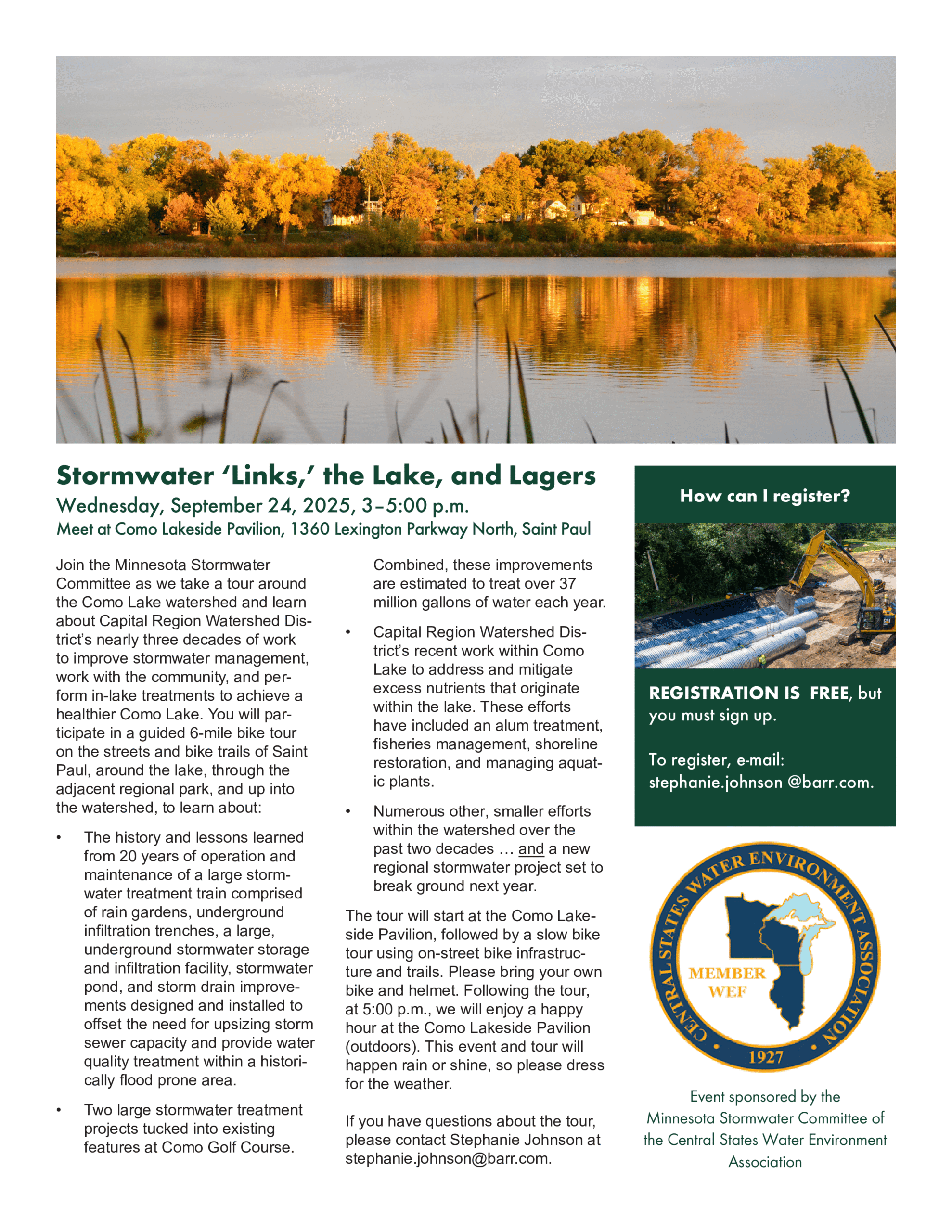 Join the Minnesota Stormwater Committee as we take a tour around the Como Lake watershed and learn about Capital Region Watershed District’s nearly three decades of work to improve stormwater management, work with the community, and perform in-lake treatments to achieve a healthier Como Lake. You will participate in a guided 6-mile bike tour on the streets and bike trails of Saint Paul, around the lake, through the adjacent regional park, and up into the watershed, While learning about various related topics.